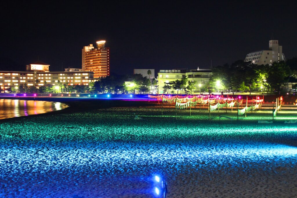 延長620mに渡る白砂の浜を光と音で彩るライトアッププロジェクト「SHIRARAHAMA LIGHT PARADE by FeStA LuCe」。白良浜での美しいマジックアワーからナイトタイムを満喫できるよう、光とゆったりとしたアンビエントミュージックで織りなす演出と、15分毎に約3分間、アップテンポな音楽とカラフルな照明演出を行い、冬の白良浜を光と音で彩ります。