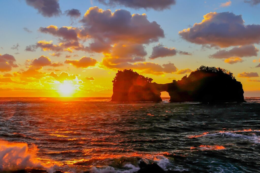 和歌山県内には多くの名勝がありますが、その中の一つである「円月島」。円月島は白良浜と並ぶ南紀白浜を代表する景観です。円月島は夕陽の絶景スポットであり、日本の夕日百選にも選ばれるほどの美しさです。