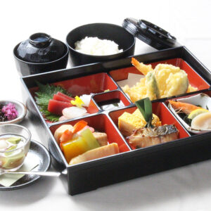 季節の野菜焚き合わせ、天ぷら盛り合わせ、お造り三種盛り合わせ、焼き物(出汁巻き・焼き魚)、酢の物(海老、貝柱)、御飯、香物、御吸物、甘味