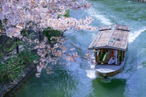 十石舟は江戸時代に淀川を酒や米、旅客を運んだ三十石舟を復元。酒蔵に柳が映える宇治川派流を約50分かけて往復します。酒蔵のまち・伏見の桜並木を、江戸時代にタイムスリップした気分でお楽しみください。