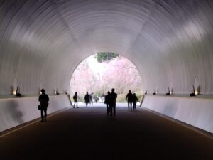 1997年にオープンしたMIHOミュージアムはフランスのルーヴル美術館のガラスのピラミッド、ワシントンのナショナルギャラリー東館などで世界的に知られるI.M.Pei氏による設計建築物です。レセプション棟から美術館棟に向かい、桜並木を通り抜け途中にあるトンネルの中から振り返るとの壁面に桜のピンク色が映り込んだ景色がご覧いただけます。